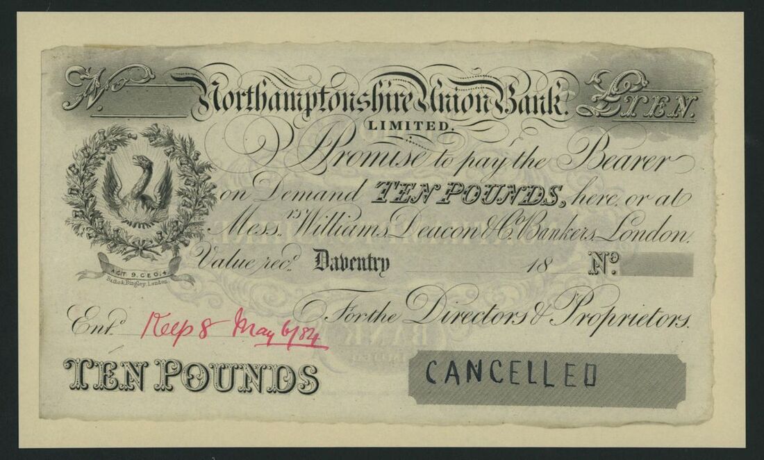 Northamptonshire Union Bank Limited, proof £10, Daventry, dated 18--, unlisted under this branch, ink cancelled, Williams, Deacon, Labouchere & Co. mentioned in Outing 2693 as agents circa. 1826-28, hand-dated with ink annotation, obverse and reverse designs,