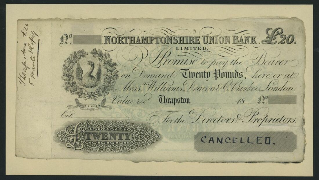 Northamptonshire Union Bank Limited, proof £20, Thrapston, dated 18--, unlisted under this branch, ink cancelled, Williams, Deacon, Labouchere & Co. mentioned in Outing 2693 as agents circa. 1826-28, obverse and reverse designs,