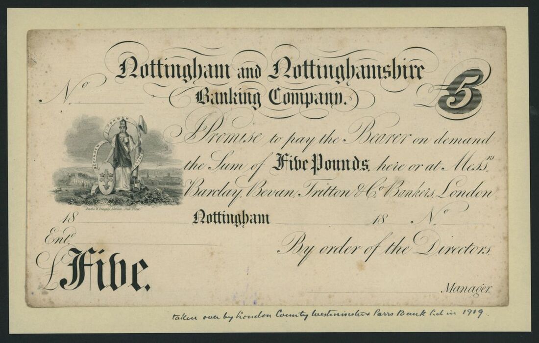 Nottingham and Nottinghamshire Banking Company, proof £5, Nottingham, dated 18--, Barclay, Bevan, Tritton, Twells & Co. Bankers are mentioned as London agents under Outing 2591, circa. 1865-88, uniface,