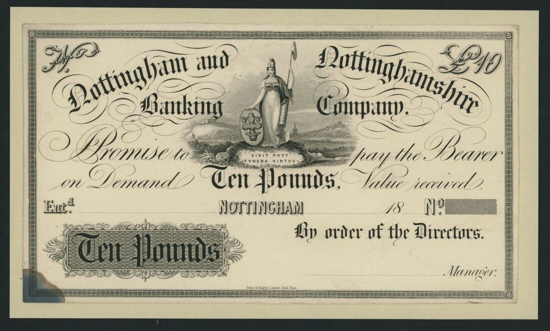 Nottingham and Nottinghamshire Banking Company, proof £10, Nottingham, dated 18--, uniface,