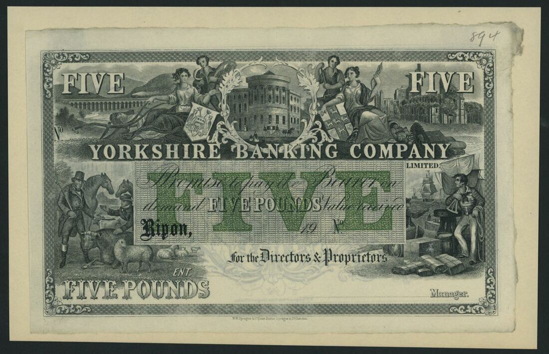 Yorkshire Banking Company Limited, proof £5, Ripon, dated 19--, with underprint, obverse and reverse designs,