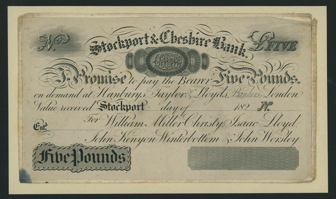 Stockport & Cheshire Bank, proof £5, Stockport, dated 182-, taken over by the Manchester & Liverpool District Banking Company in 1836, uniface,