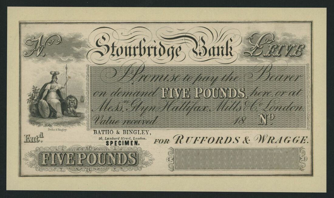 Stourbridge Bank, specimen £5, dated 18--, stamped 'BATHO & BINGLEY SPECIMEN', uniface,