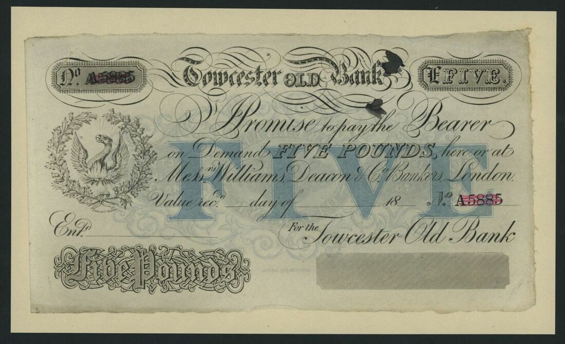 Towcester Old Bank, proof £5, dated 18--, serial number A5885, serial number struck through with ink, Williams, Deacon, Labouchere & Co. mentioned in Outing 2693 as agents circa. 1826-28, obverse and reverse designs,