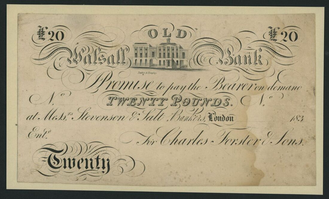 Walsall Old Bank, proof £20, dated 183-, Charles Forster & Sons mentioned in association with Walsall Old Bank, 1846-8, Stevenson & Salt mentioned in Outing 2727 as London agents, uniface,