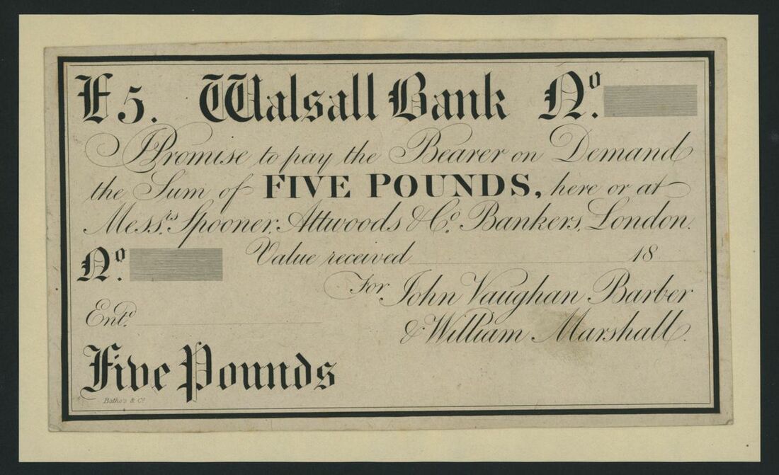 Walsall Bank, proof £5, dated 18--, John Vaughan Barber & William Marshall are associated with the Walsall & Staffordshire Bank, which failed in 1841. Attwoods, Spooner & Co. are mentioned in Outing without a trading name but associated with Birmingham Bank, circa. 1865, uniface,