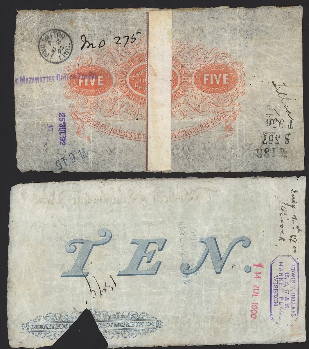 Wisbech and Lincolnshire Bank, [2 notes] £5, £10, 1874-90, £5, 17th September 1890, serial number X975;