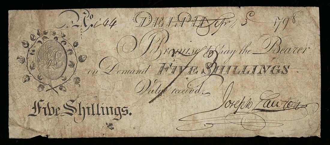 Delph Bank, 5 Shillings, 3rd September 1798, serial number (?)44, no trading name, signed Joseph Lawton;