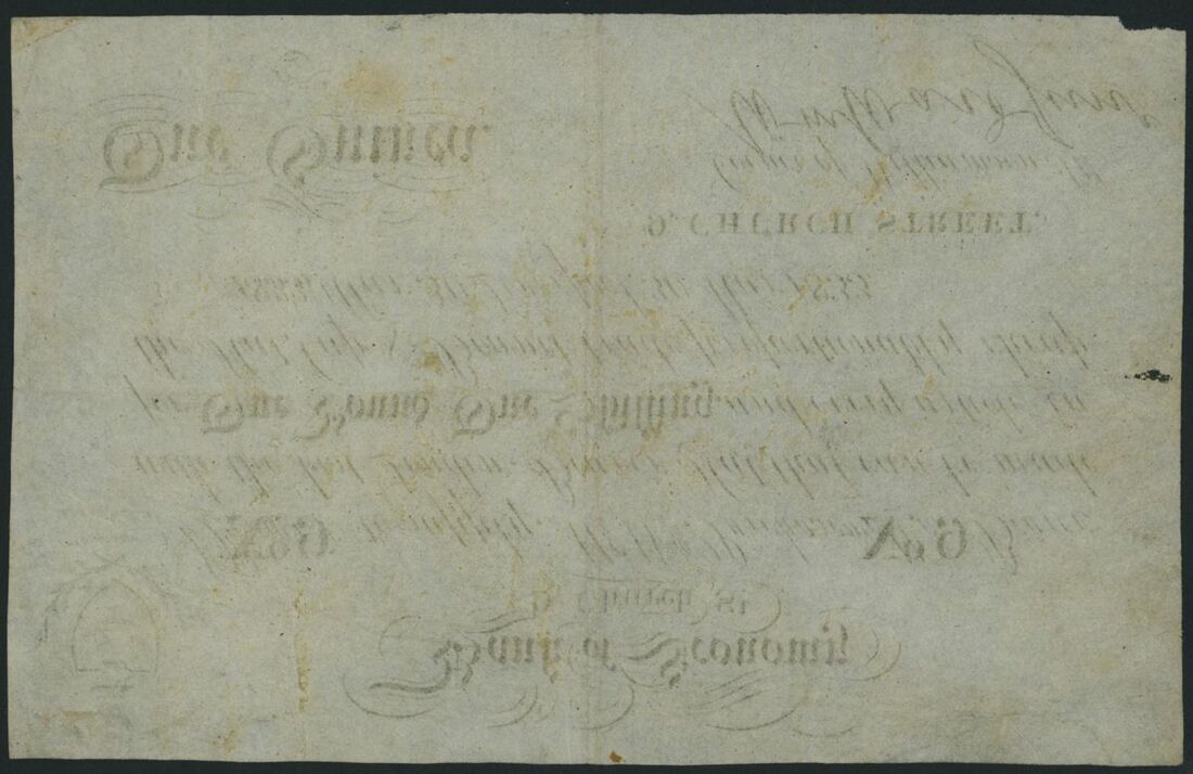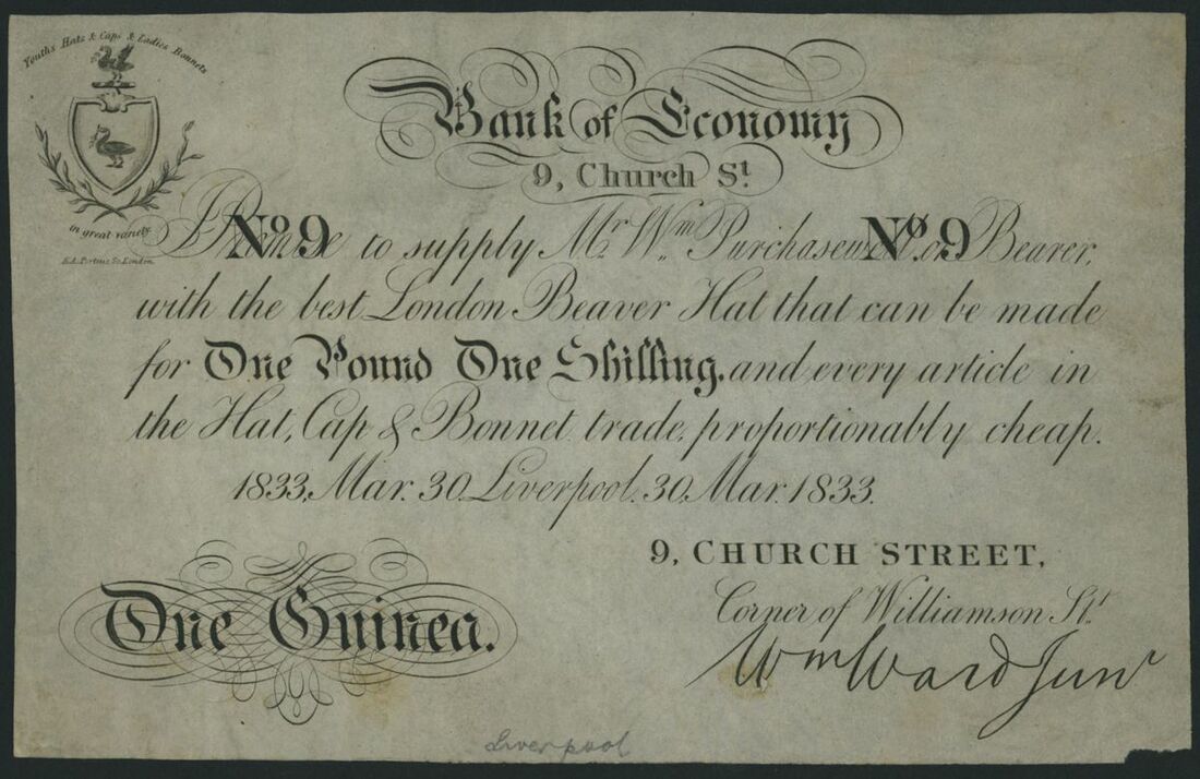 Collection of Provincial Skit Notes, [4 notes] Bank of Economy, 1 Pound 1 Shillings, Liverpool, 30th March 1833, "Promise to supply...the best London Beaver Hat that can be made for One Pound One Shilling, and every article in the Hat, Cap & Bonnet trade, proportinably cheap";