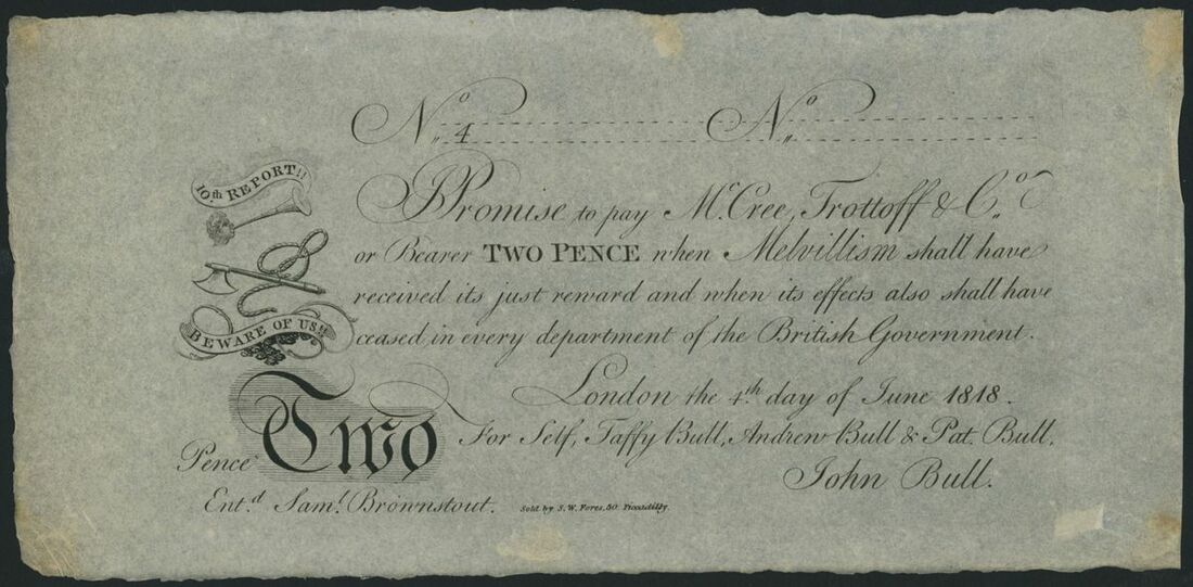 no bank title, 2 Pence, London, 4th June 1818, "Promise to pay...Two Pence when Melvillism shall have received its just reward and when its effects also shall have ceased in every department of the British Government";