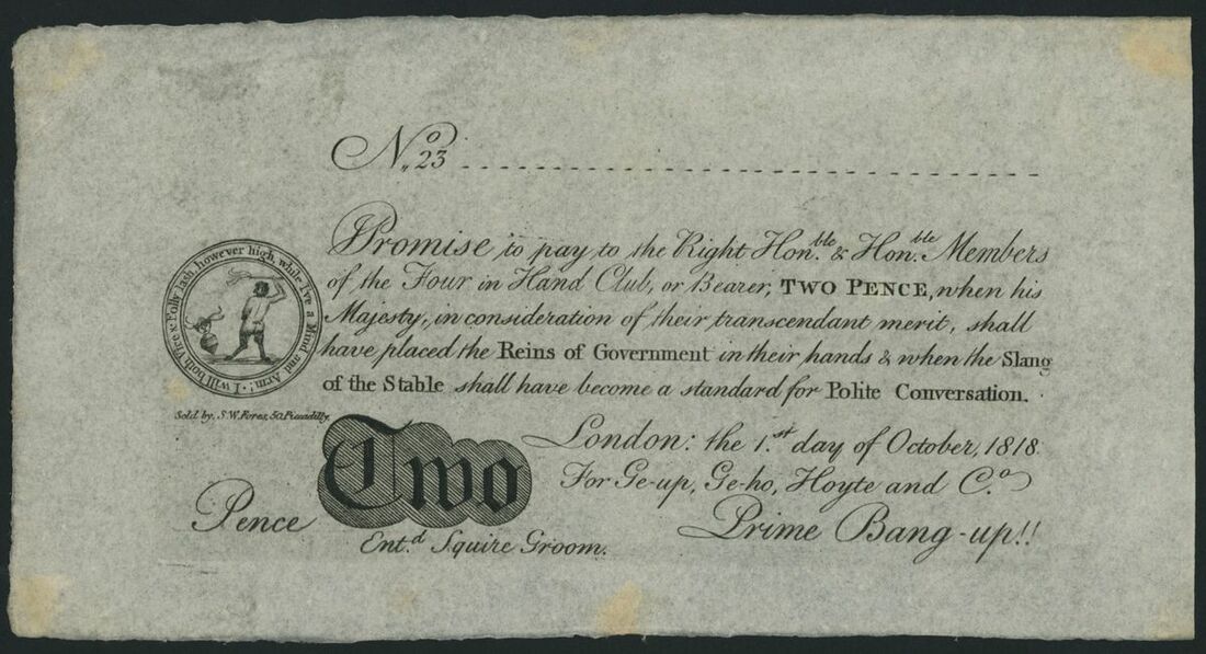 no bank title, 2 Pence, 1st October 1818, promise to pay the Right Honourable and Honourable Members of the Four in Hand Club, or Bearer, Two Pence, when his Majesty, in consideration of their transcendant merit, shall have placed the Reins of Government in their hands & when the Slang of the Stable shall have become a standard for Polite Conversation";