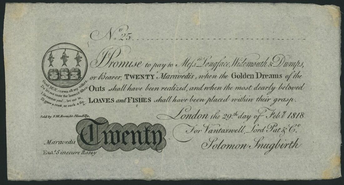 no bank title, 20 Maravedis, London, 29th February 1818, "Promise to pay...Twenty Maravedis, when the Golden Dreams of the Outs shall have been realised, and when the most dearly beloved Loaves and Fishes shall have been placed within their grasp"
