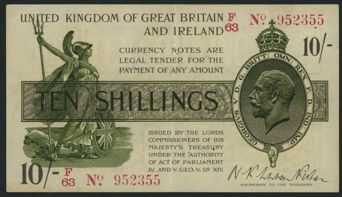Treasury Series, Fisher signature, 10 Shillings, ND (1919), serial number F/63 952355, (EPM T25), very fine, pinholes