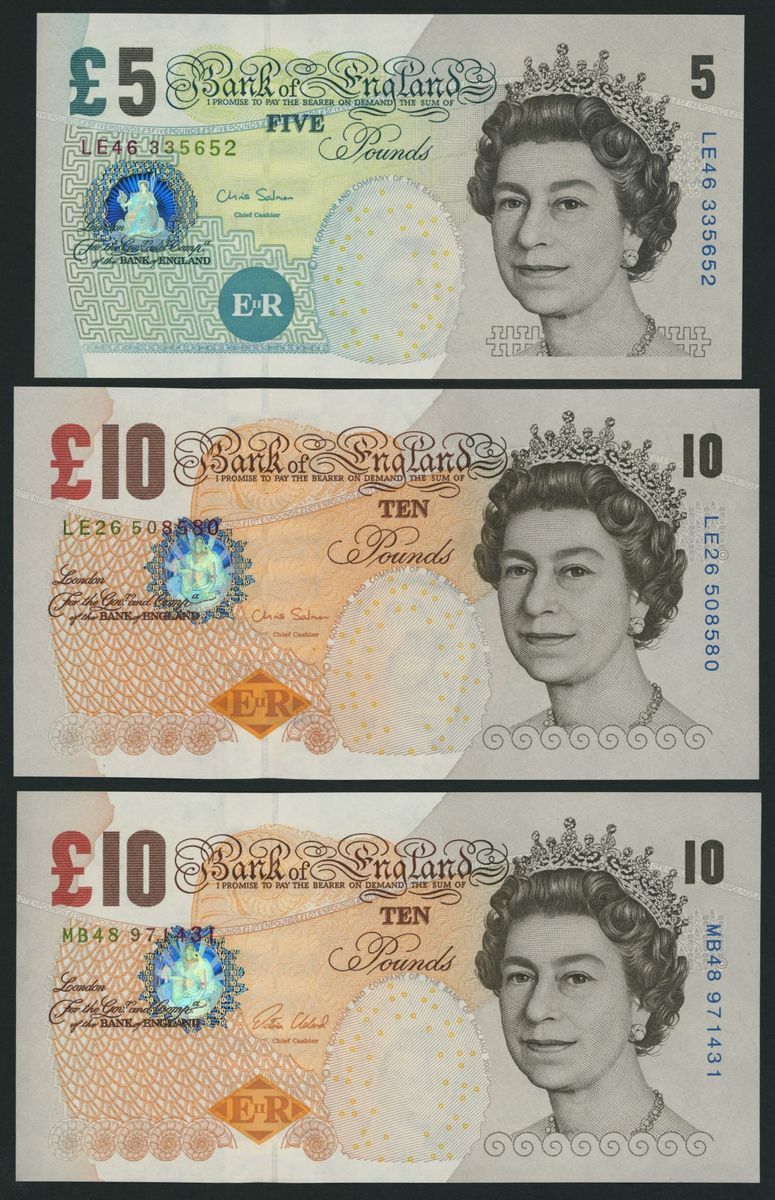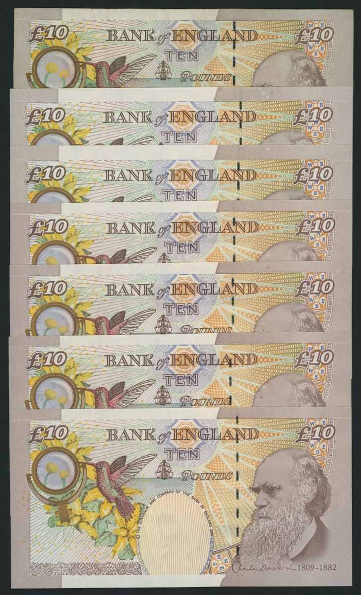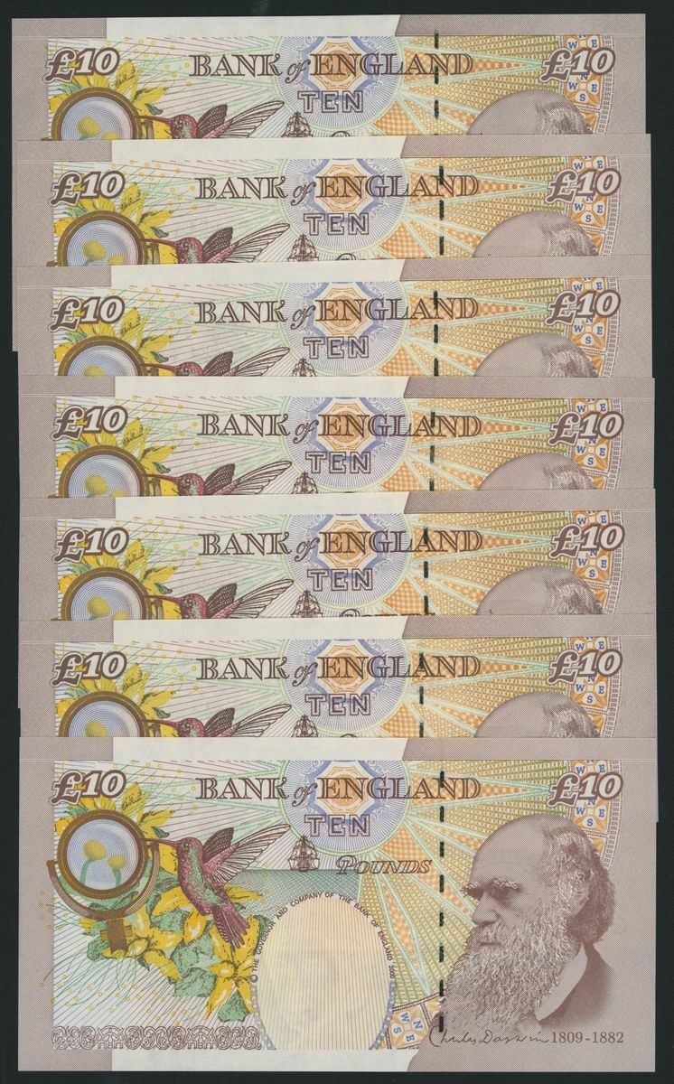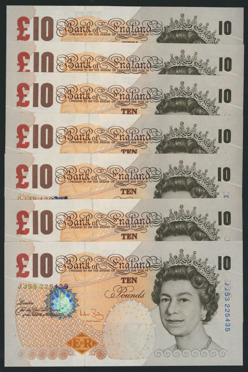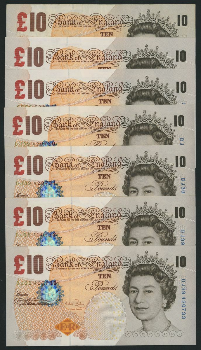 £10 (16), including consecutive serial numbers CE66 601973-4 and DJ9 420730-39,