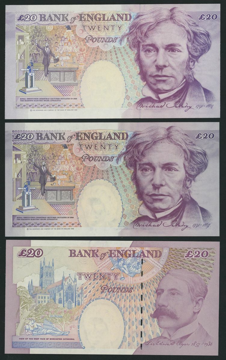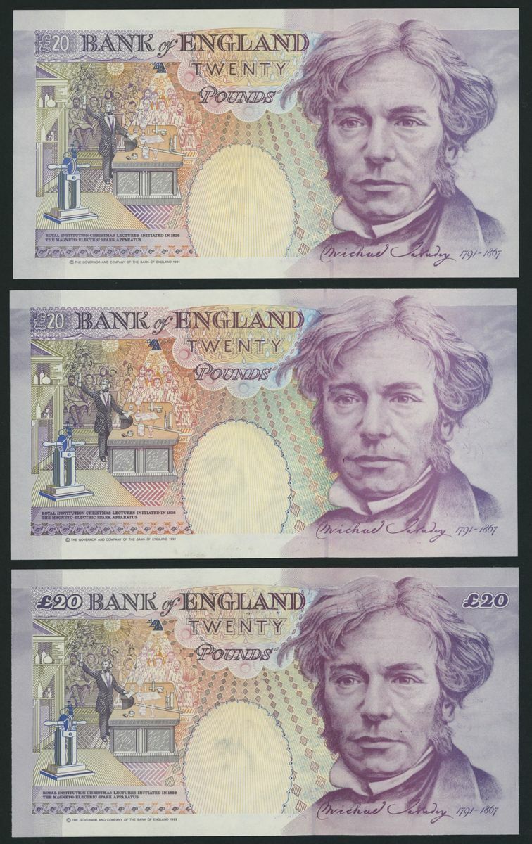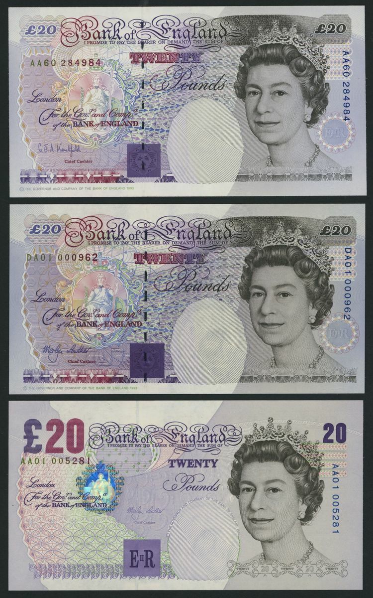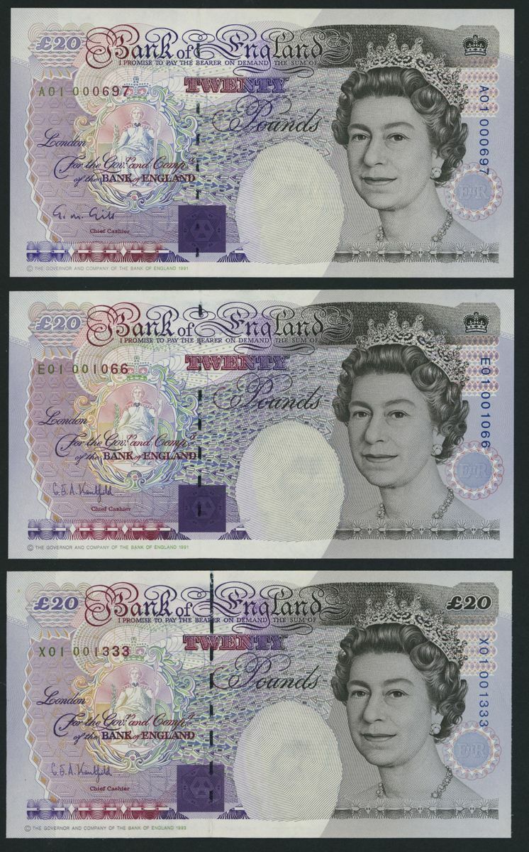Kentfield signature (3), ND (1991), [FIRST RUN] serial number E01 001066, ND (1993), [FIRST RUN] serial number X01 001333, ND (1994), serial number AA60 284984;