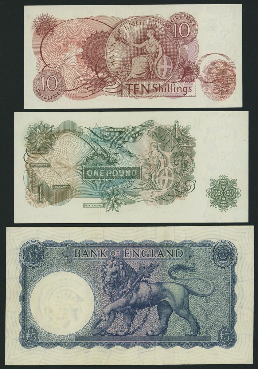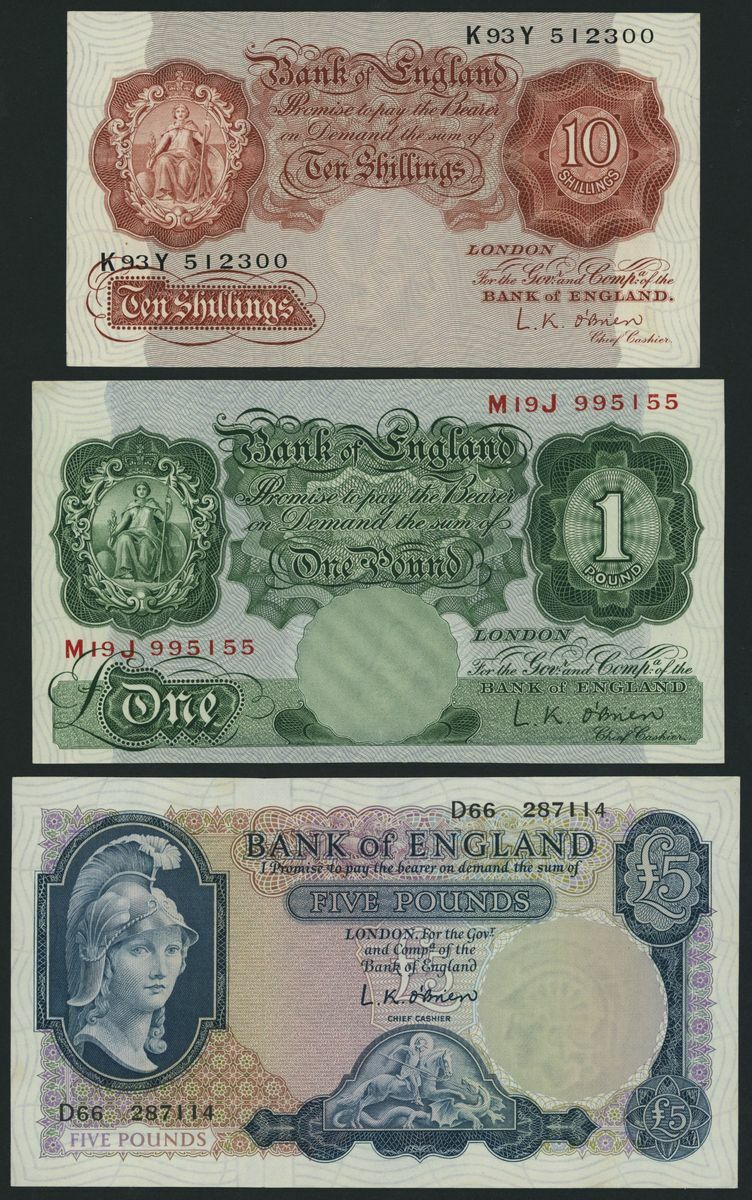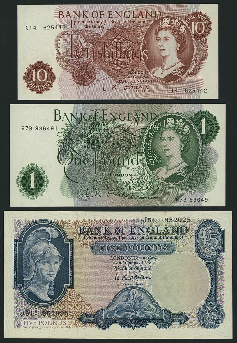 (x) Bank of England, [6 notes] 10 Shillings, £1, £5, 1955-61, L. K. O'Brien signature, (Pick 368c, 369c, 371, 372, 373a, 374a, EPM B271, 273, 277, 280, 286, 282), good extremely fine to uncirculated, toning (6 notes)