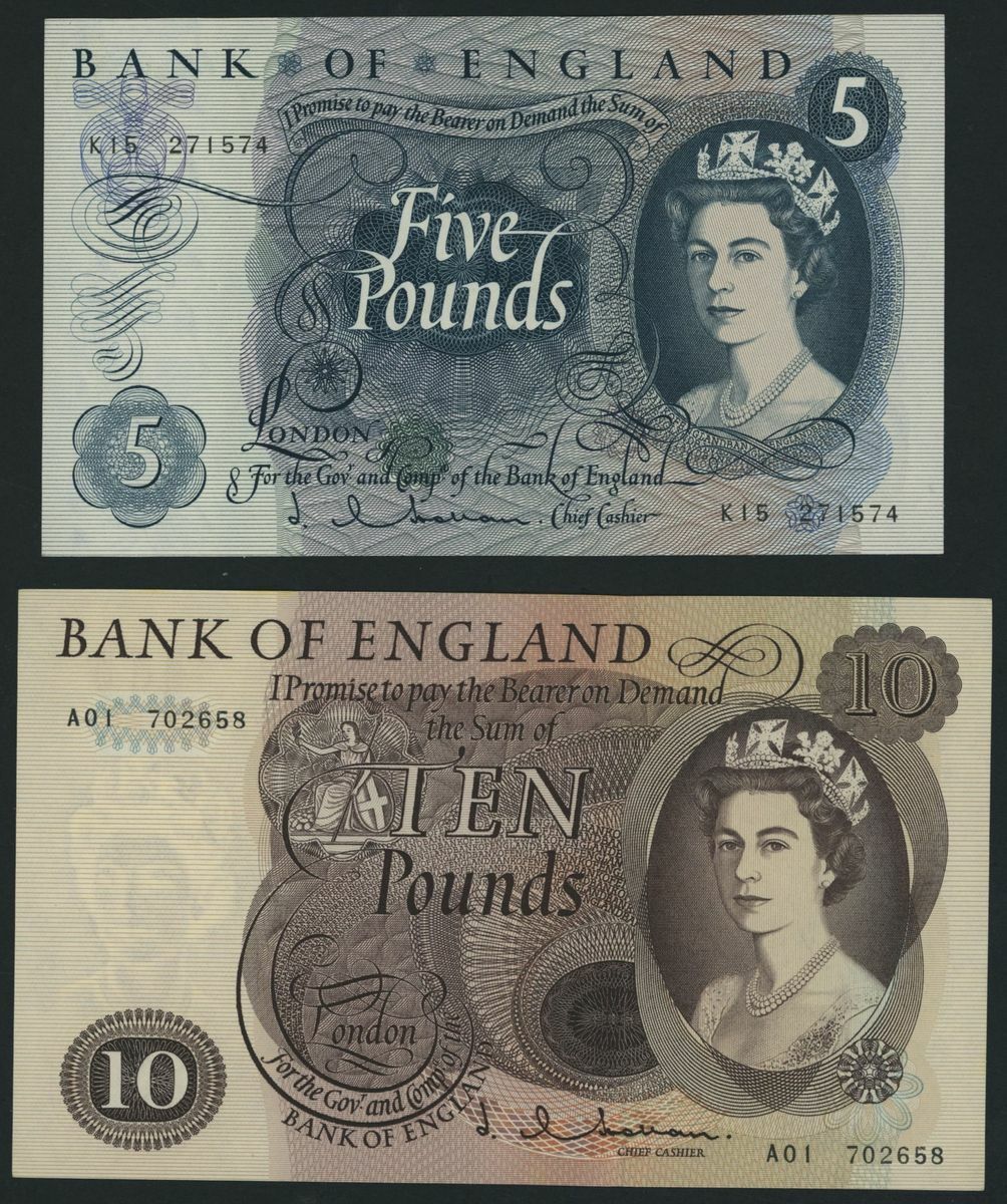 Hollom: £5, ND (1963), serial number K15 271574 and [FIRST RUN] £10, ND (1964), serial number A01 702658;