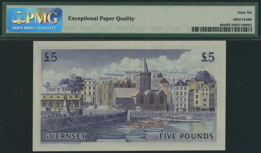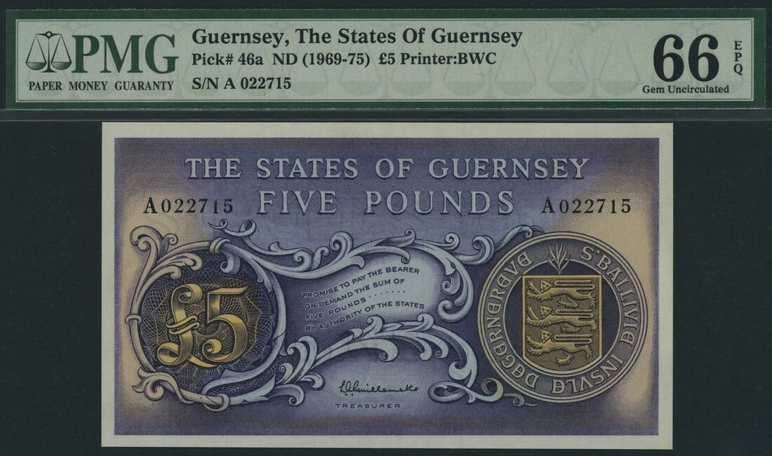 (x) States of Guernsey, [TOP POP] £5, ND (1969), serial number A022715, (Pick 46a, BNB 151a), in PMG holder 66 EPQ Gem Uncirculated, tied for highest graded note on PMG Census