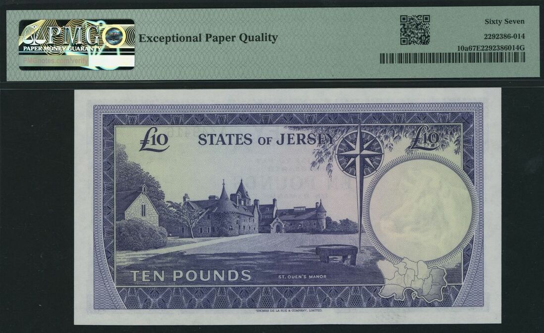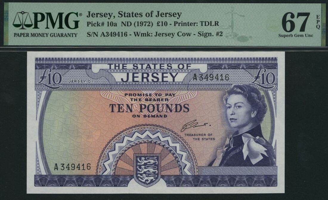 (x) States of Jersey, £10, ND (1972), serial number A349416, (Pick 10a), in PMG holder 67 EPQ Superb Gem Uncirculated