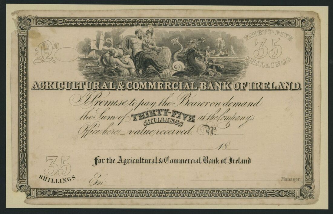 Agricultural & Commercial Bank of Ireland, proof 35 Shillings, dated 18--, no branch name, uniface,