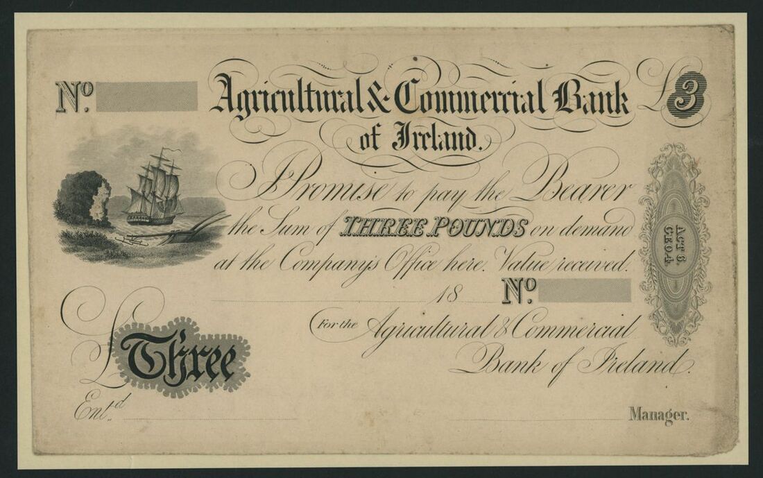 Agricultural & Commercial Bank of Ireland, proof £3, dated 18--, no branch name, uniface,