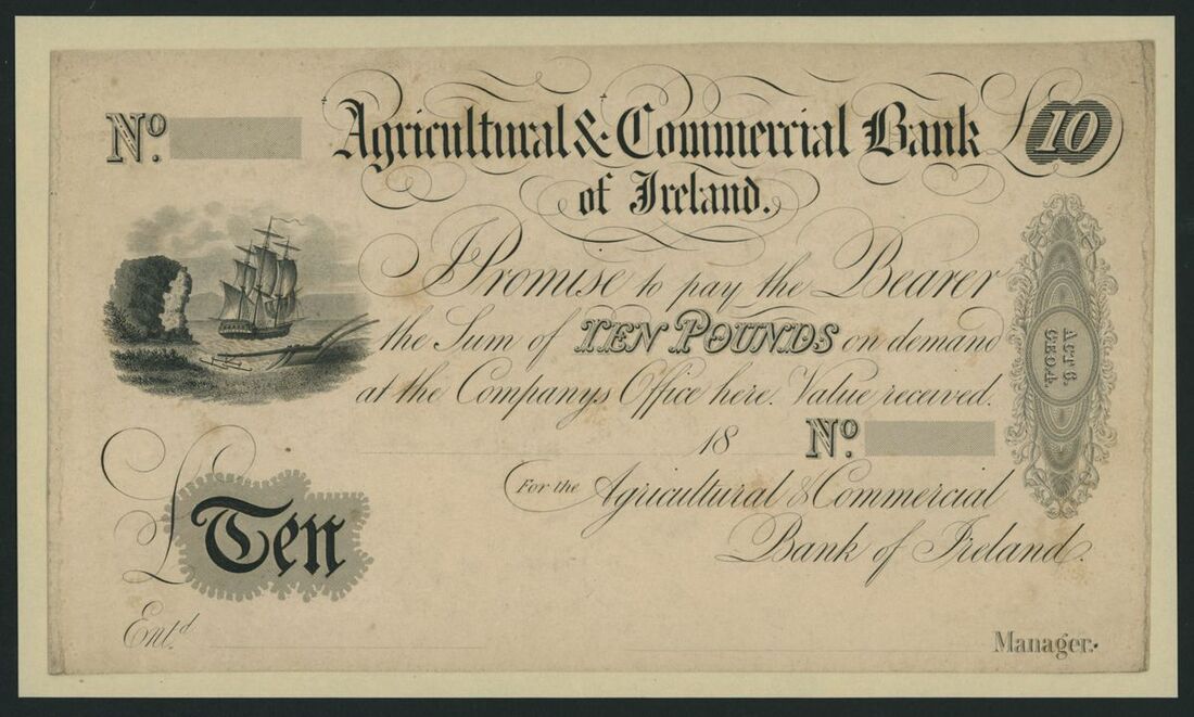 Agricultural & Commercial Bank of Ireland, proof £10, dated 18--, no branch name, very rare, only an issued note prepared for the Cork branch has been listed for this denomination, uniface,
