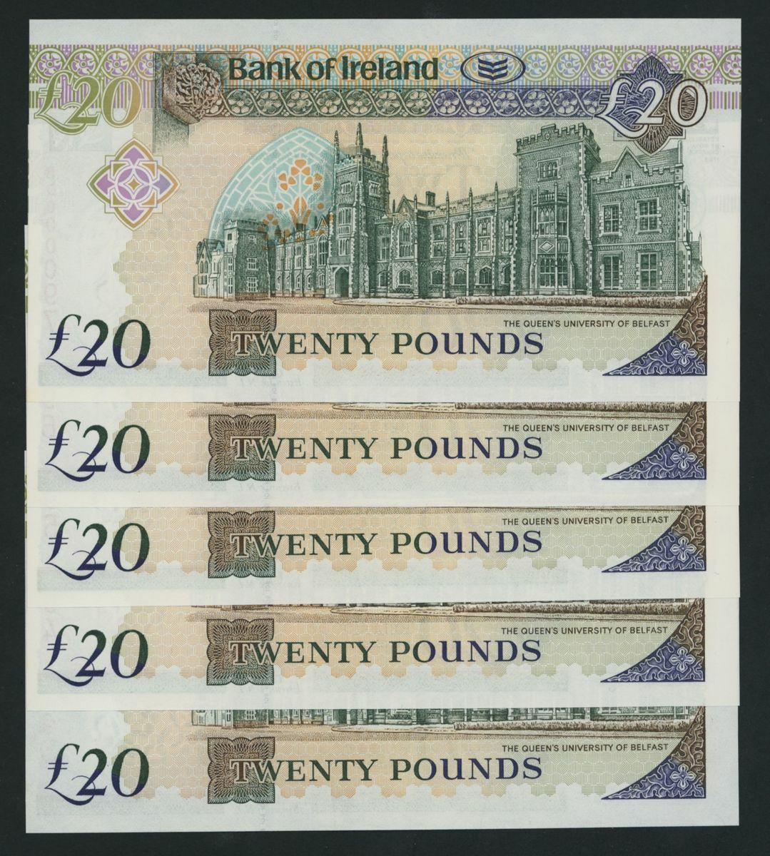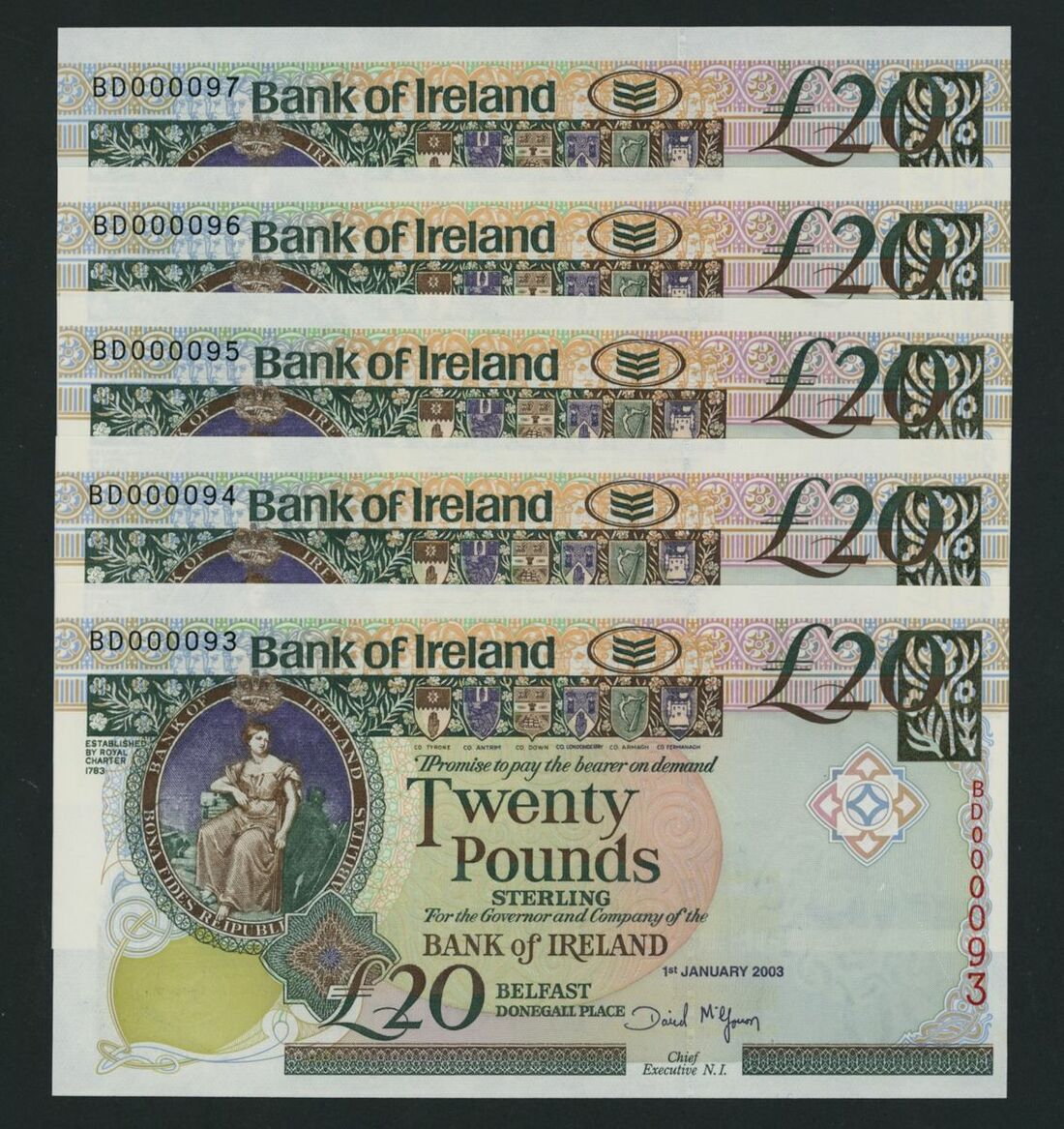 Bank of Ireland, [consecutive set], (5 notes), £20, Belfast, 1st January 2003, first prefix, low serial number,