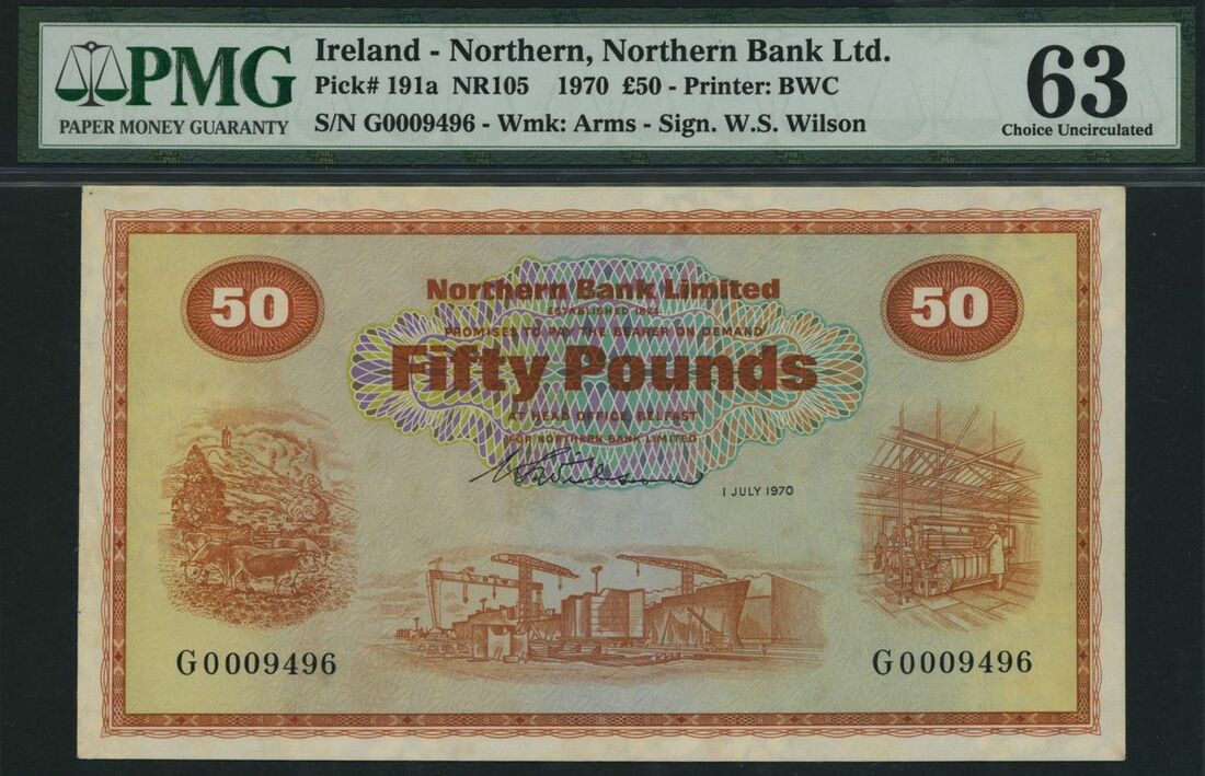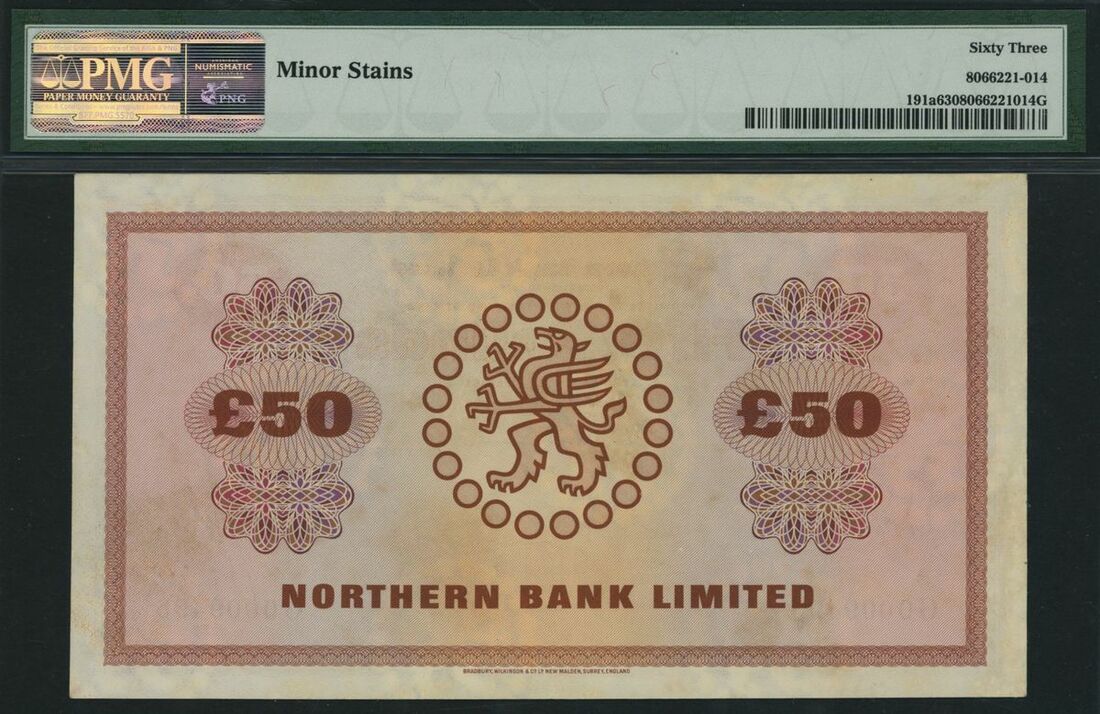 (x) Northern Bank Limited, Northern Ireland, £50, Belfast, 1st July 1970, serial number G0009496, (Pick 191a, PMI NR 105), in PMG holder 63 Choice Uncirculated, minor stains, only 3 notes currently graded on PMG Census, rare in any grade!