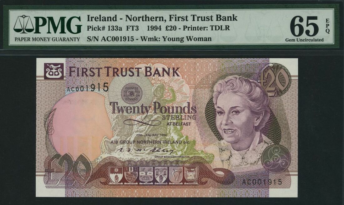 (x) First Trust Bank, Northern Ireland, £20, Belfast, 10th January 1994, serial number AC001915, (Pick 133a, PMI FT 3), in PMG holder 65 EPQ Gem Uncirculated