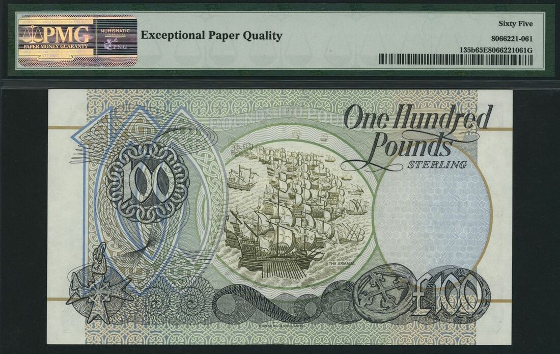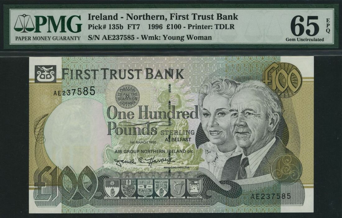 (x) First Trust Bank, Northern Ireland, [TOP POP] £100, Belfast, 1st March 1996, serial number AE237585, (Pick 135b, PMI FT 7), in PMG holder 65 EPQ Gem Uncirculated, tied for the highest graded note on PMG Census