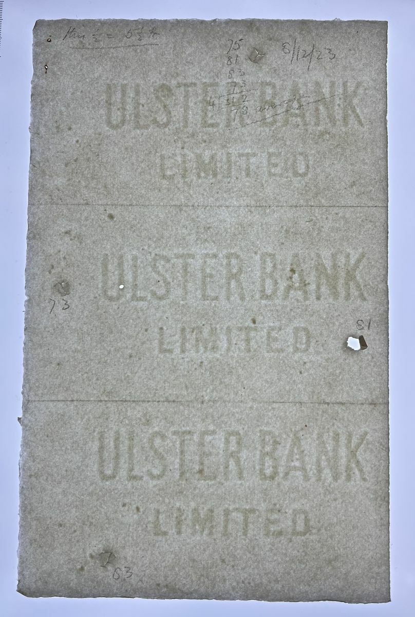 Ulster Bank Limited, Watermarked Paper, punch hole cancelled, paper makers annotations, pinholes and rust marks, otherwise as produced