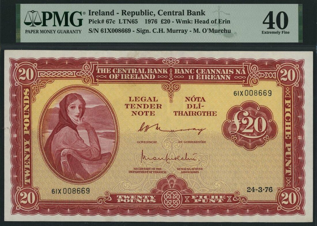 (x) Central Bank of Ireland, £20, Dublin, 24th March 1976, serial number 61X008669, (Pick 67c, PMI LTN 65), in PMG holder 40 Extremely Fine
