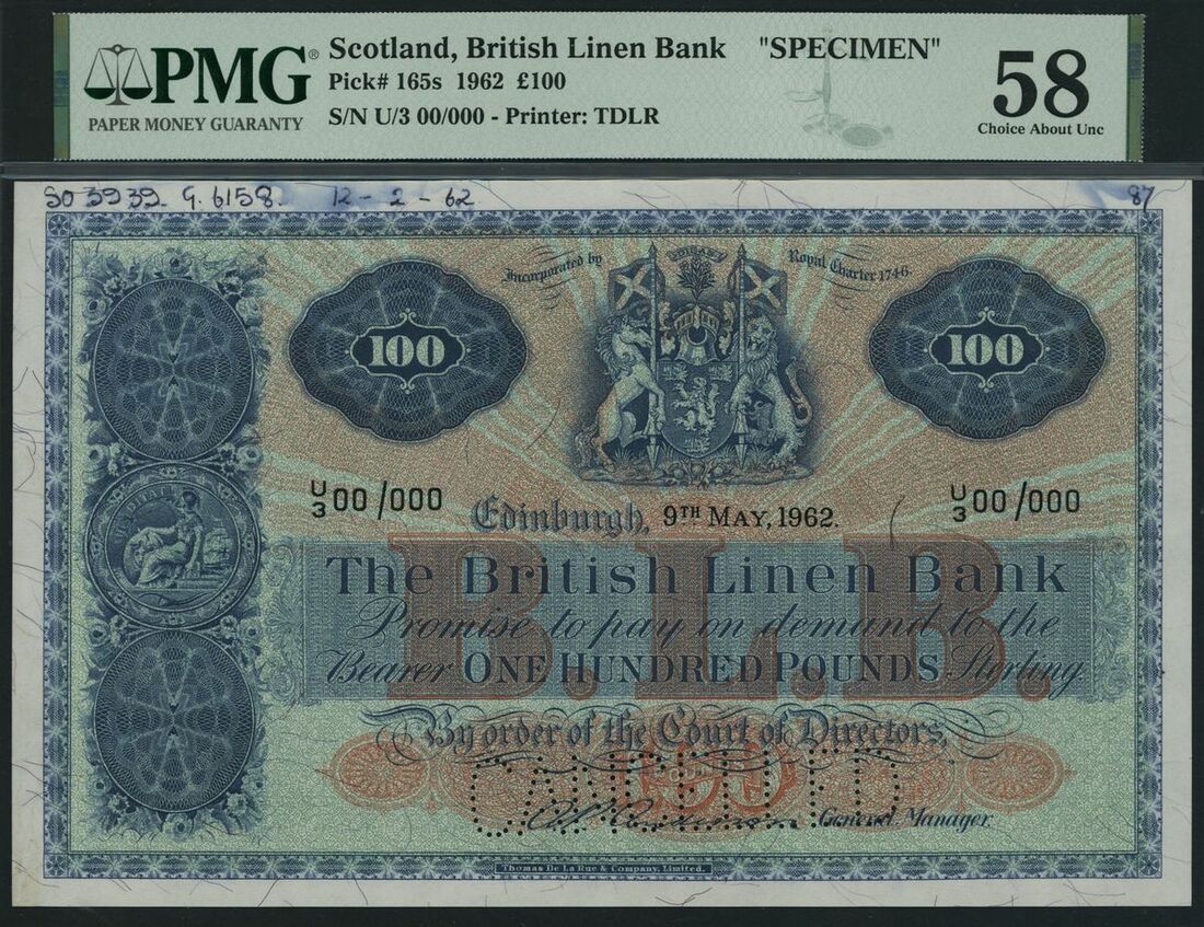 (x) British Linen Bank, Scotland, specimen £100, Edinburgh, 9th May 1962, serial number U/3 00/000, (Pick 165s, BNB 790), in PMG holder 58 Choice About Uncirculated, previously mounted, scarce