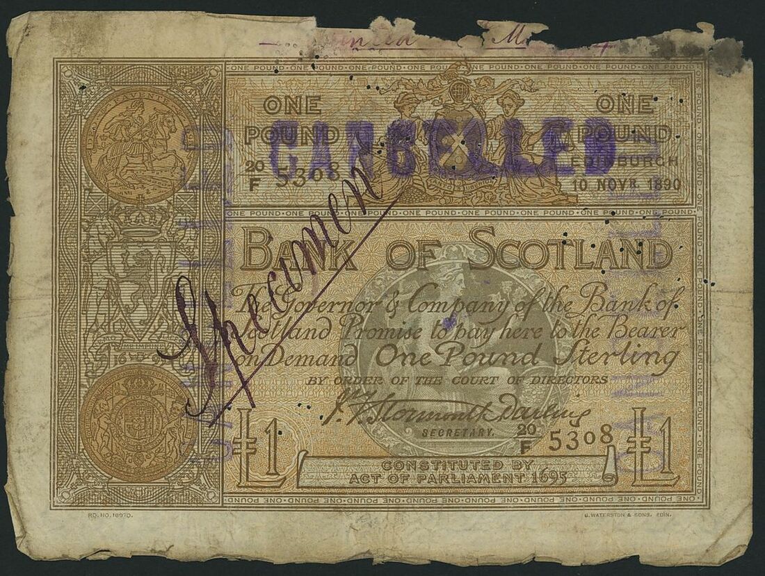(x) Bank of Scotland, £1, Edinburgh, 10th November 1890, serial number 20/F 5308, printed 18th March 1891 on reverse,