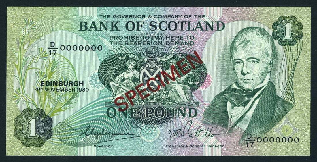 Bank of Scotland, specimen £1, Edinburgh, 4th November 1980, serial number D/17 000000, (PMS BA 113ds), uncirculated
