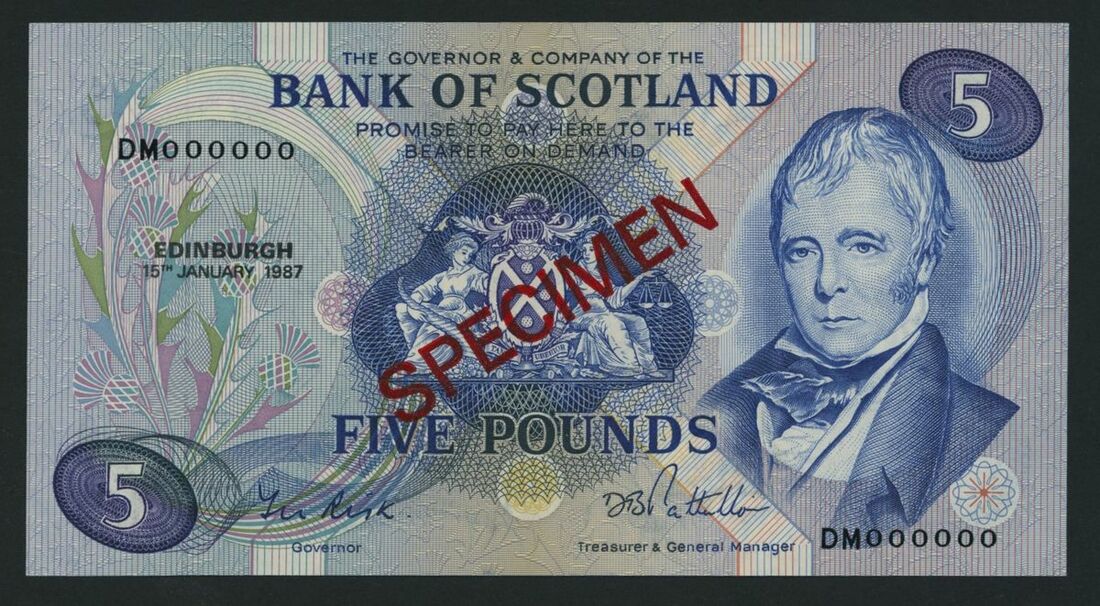 Bank of Scotland, specimen £5, Edinburgh, 15th January 1987, serial number DM 000000, (PMS BA 114fs), about uncirculated, evidence of handling
