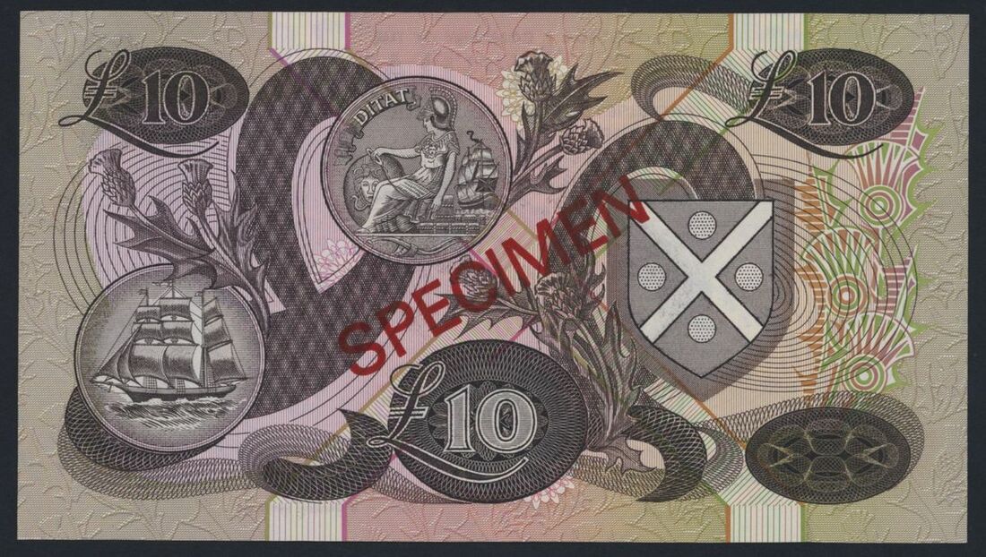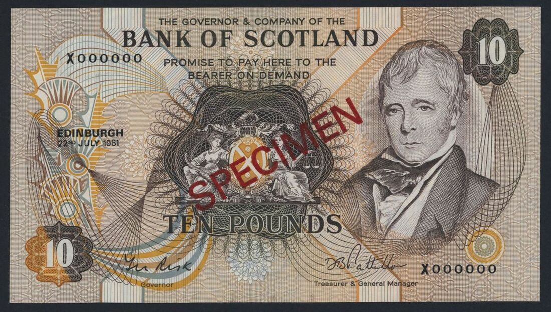 Bank of Scotland, specimen £10, Edinburgh, 22nd July 1981, serial number X 000000, (PMS BA 116cs), about uncirculated, evidence of handling