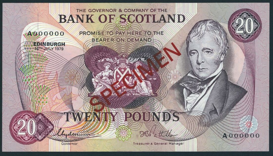 Bank of Scotland, specimen £20, Edinburgh, 16th July 1979, serial number A 000000, (PMS BA 118ds), about uncirculated, evidence of handling