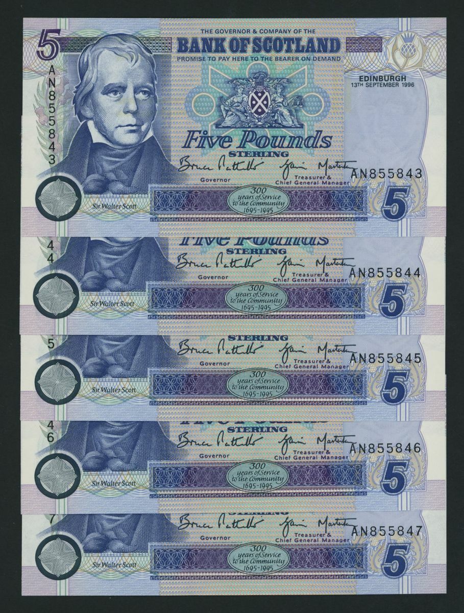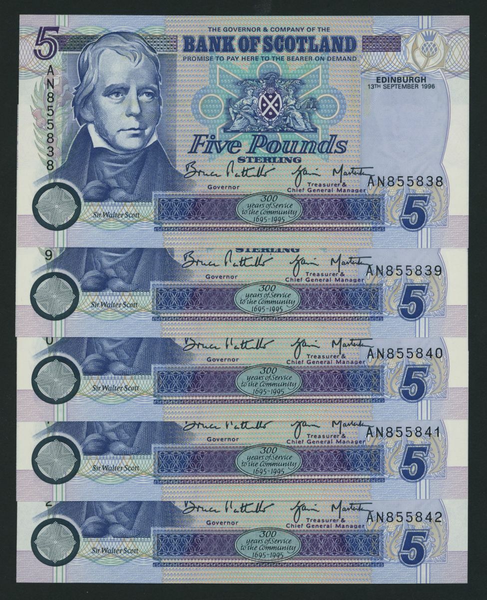 Bank of Scotland, [consecutive set] (10 notes), £5, Edinburgh, 13th September 1996, first prefix,