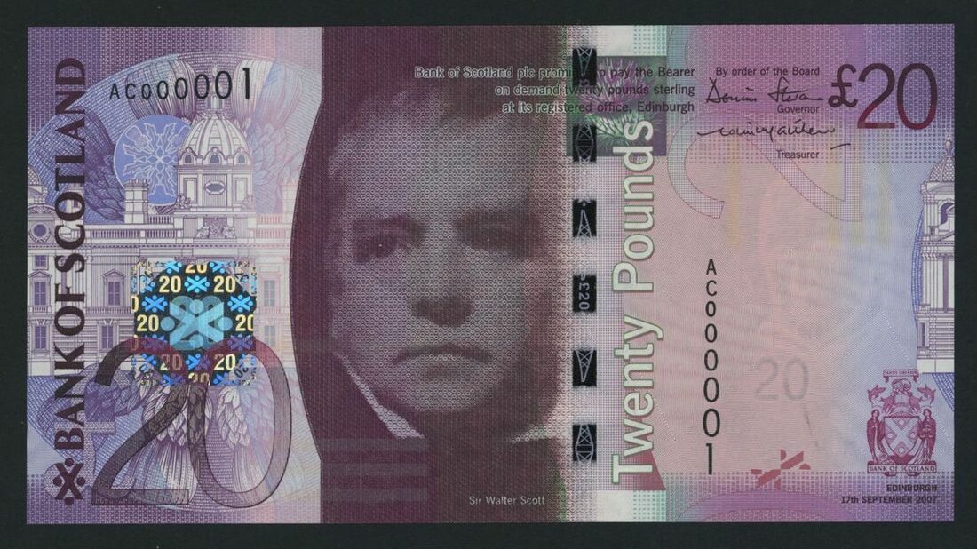 Bank of Scotland, £20, Edinburgh, 17th September 2007, serial number AC000001, lowest serial number for this prefix,