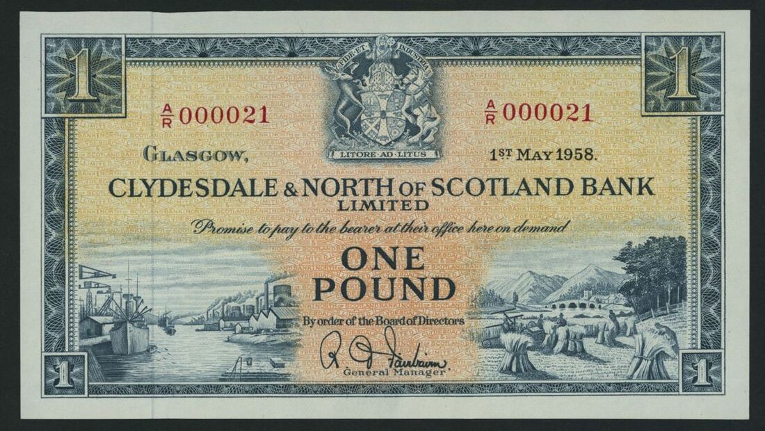 Clydesdale & North of Scotland Bank Limited, £1, Glasgow, 1st May 1958, serial number A/R 000021, low serial number,