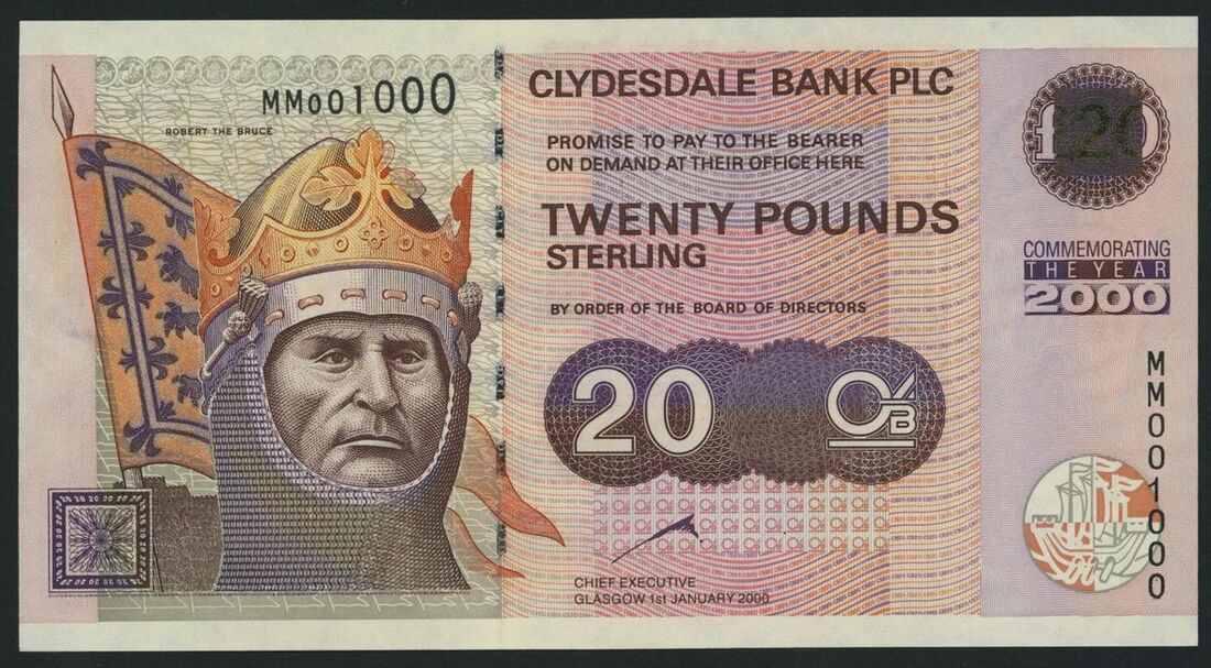Clydesdale Bank PLC, Commemorative Issue, £20, Glasgow, 1st January 2000, serial number MM 001000, special serial number prefix for the year 2000,