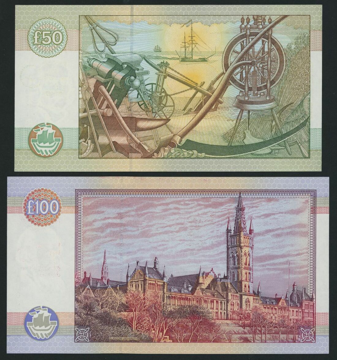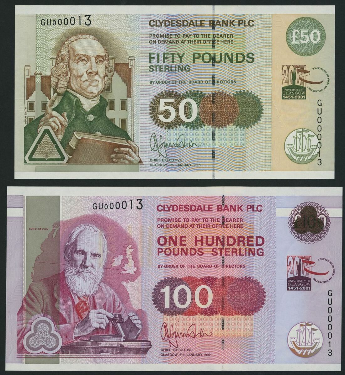 Clydesdale Bank PLC, Commemorative Pair, [2 notes] £50, £100, Glasgow, 6th January 2001, serial number GU 000013, special serial number prefixes for Glasgow University,