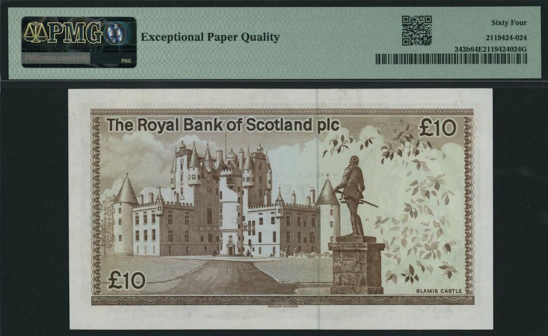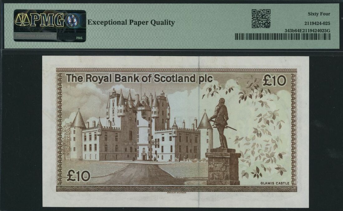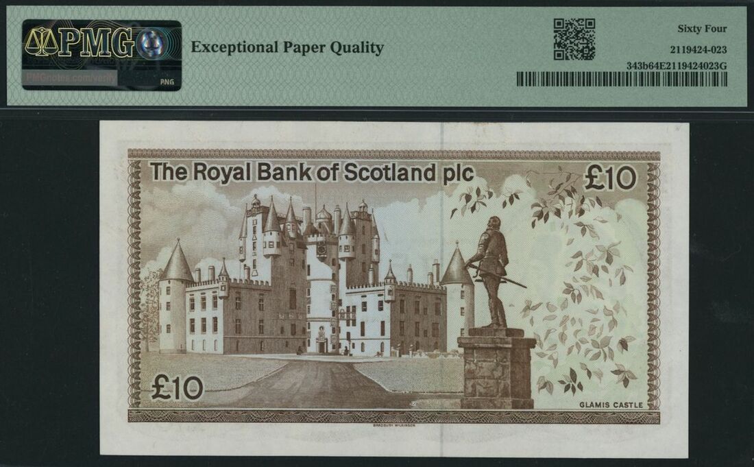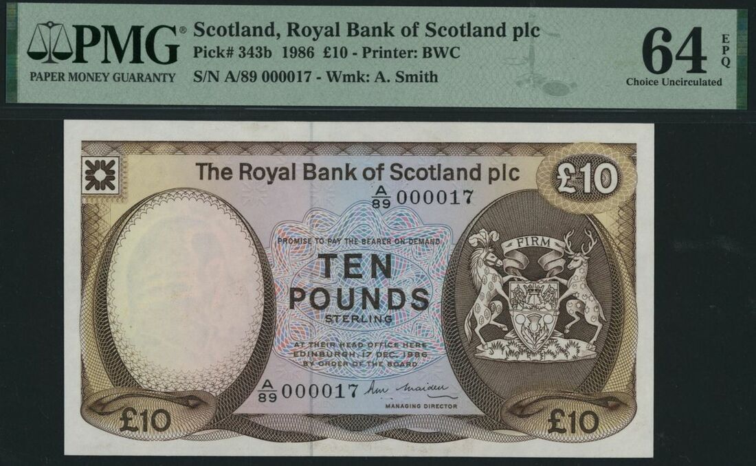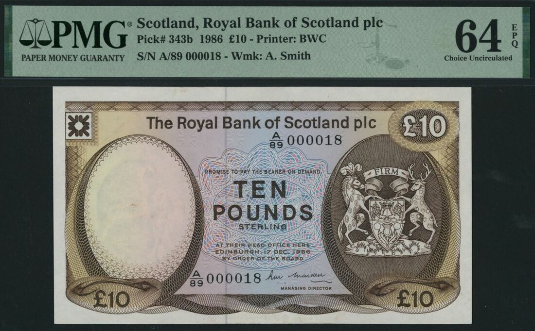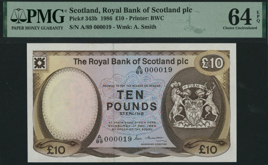 (x) Royal Bank of Scotland plc, [3 notes] £10, Edinburgh, 17th December 1986, consecutive serial numbers A/89 000017, A/89 000018, A/89 000019, (PMS RB82b, Pick 343b), all in PMG holders 64 EPQ Choice Uncirculated (3 notes)