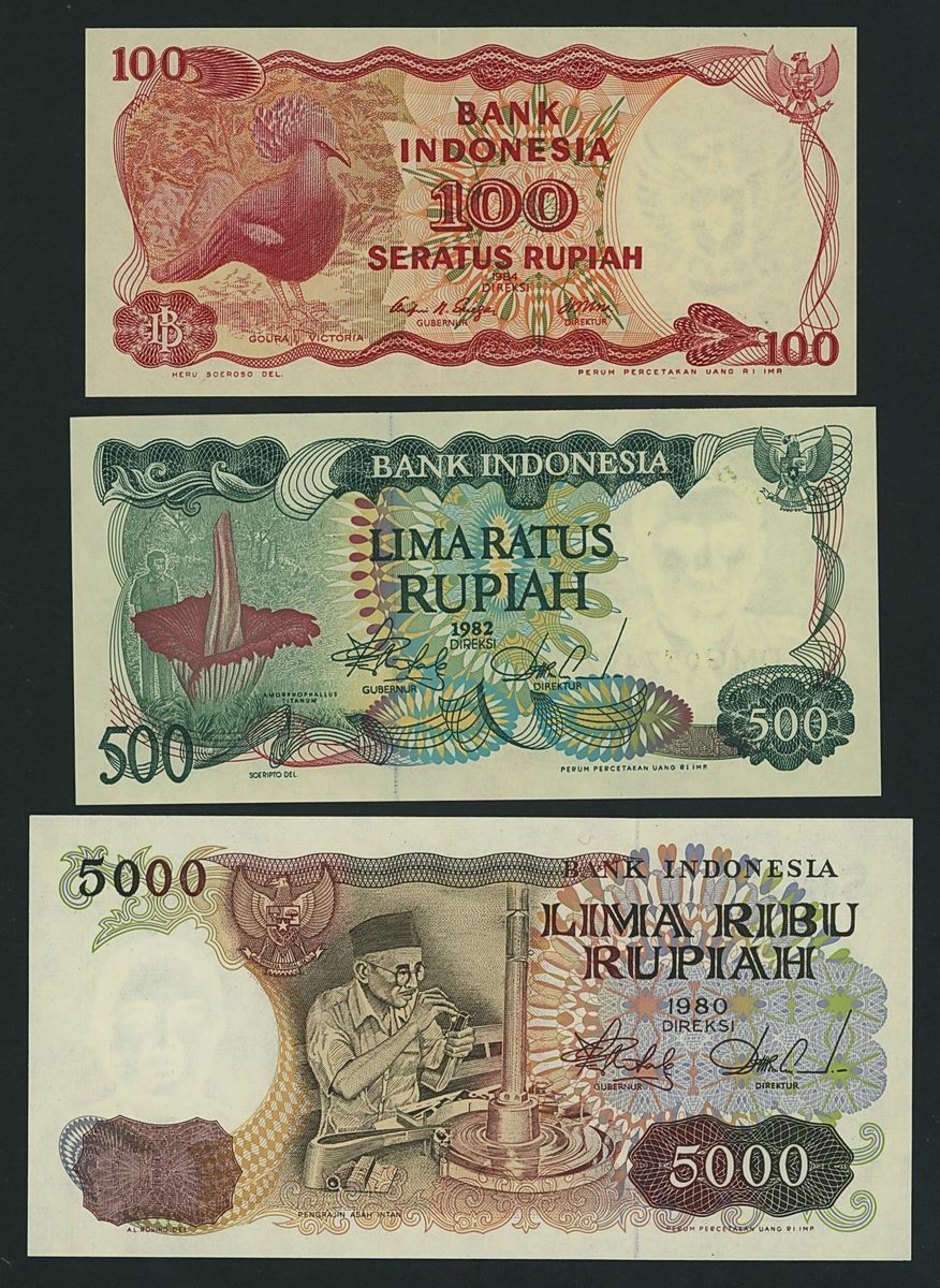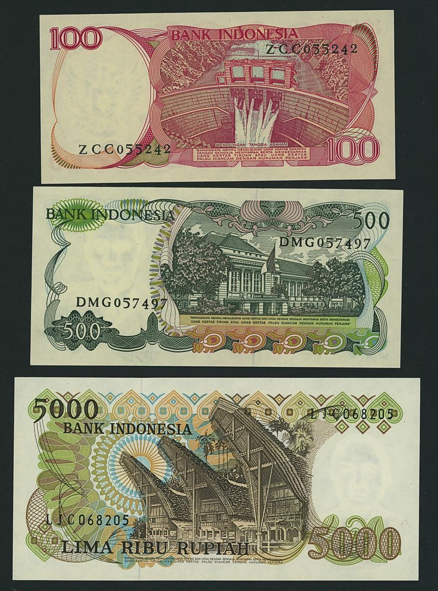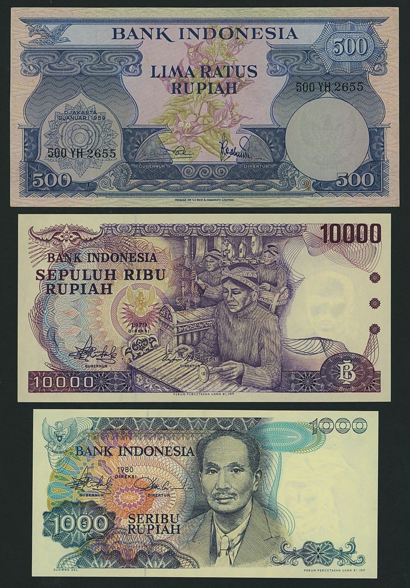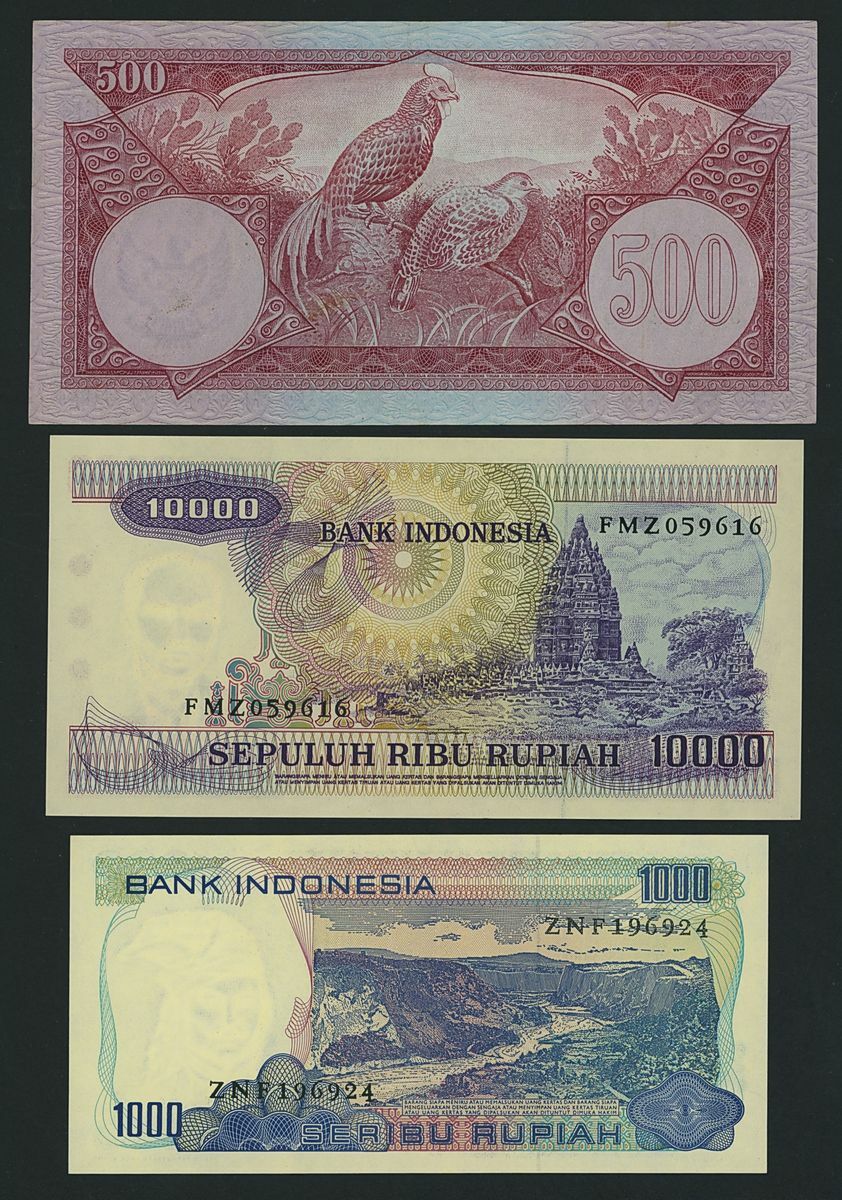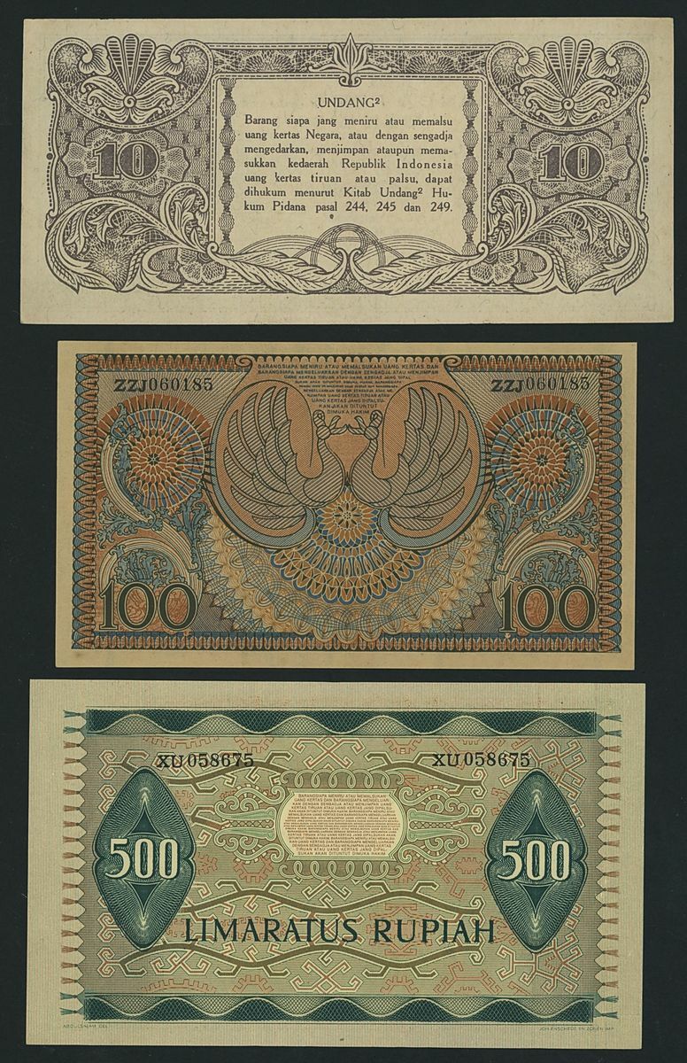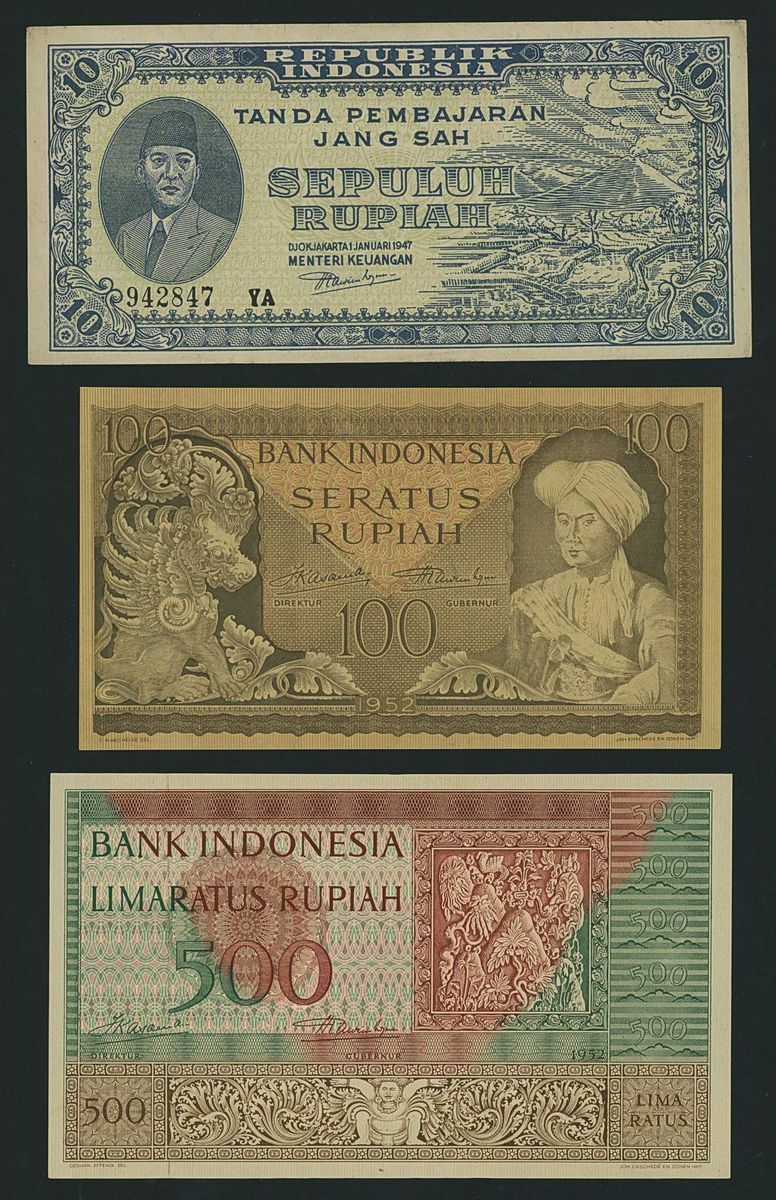 Indonesia, [9 notes] 10, 100, 500 Rupiah, 1947-84,