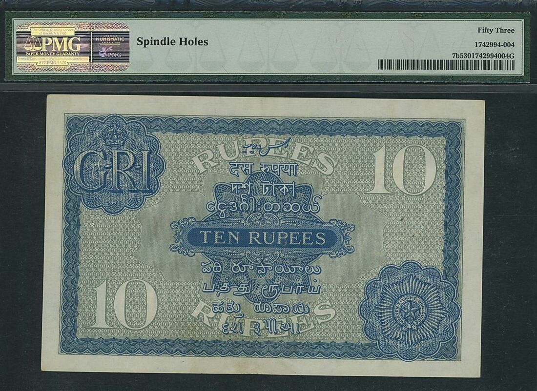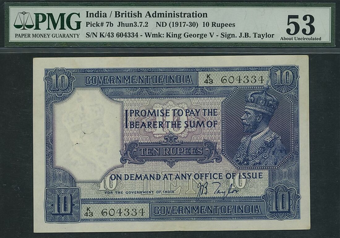 (x) Government of India, 10 Rupees, ND (1917-30), serial number K/43 604334, (Pick 7b, Jhun 3.7.2, BNB 141), in PMG holder 53 About Uncirculated, spindle holes