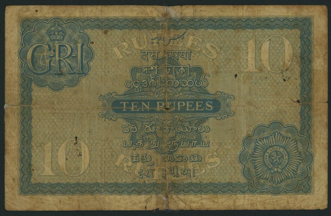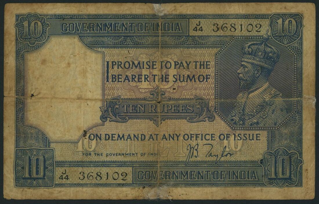 (x) Government of India, 10 Rupees, ND (1925), serial number J/44 368102, (Pick 7b, BNB 141b) good