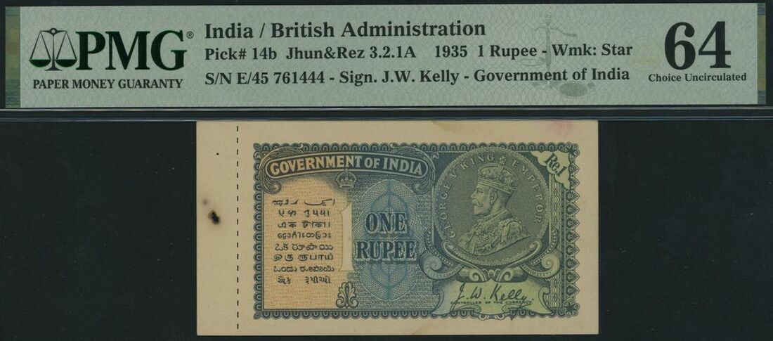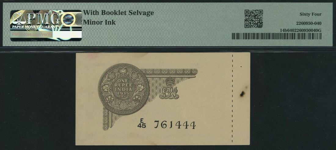 Government of India, 1 Rupee, 1935, serial number E/45 761444, (Pick 14b, Jhun&Rez 3.2.1A, BNB 148), in PMG holder 64 Choice Uncirculated, with Booklet Selvage, minor ink