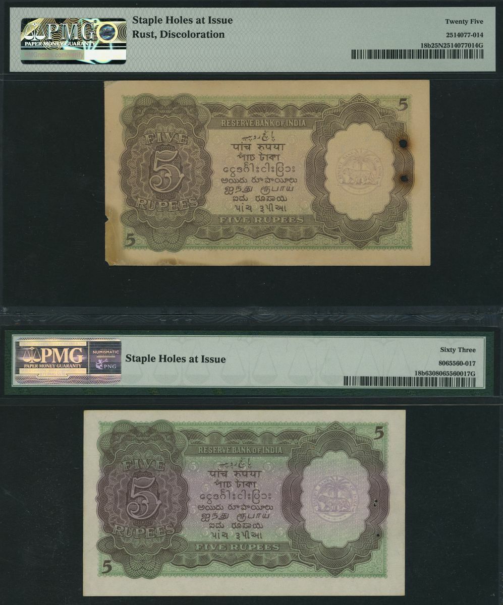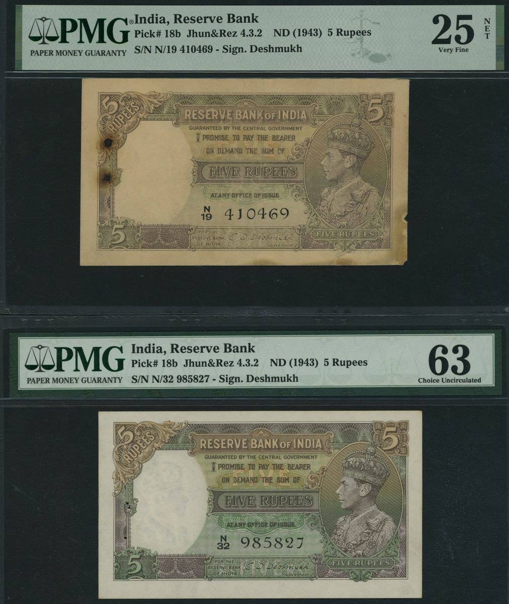 (x) Reserve Bank of India, [2 notes] 5 Rupees, ND (1943), serial numbers N/19 410469 and N/32 985827, (Pick 18b, BNB 202b), in PMG holders 25 NET Very Fine, staple holes at issue, rust, discolouration, and 63 Choice Uncirculated, staple holes at issue (2 notes)
