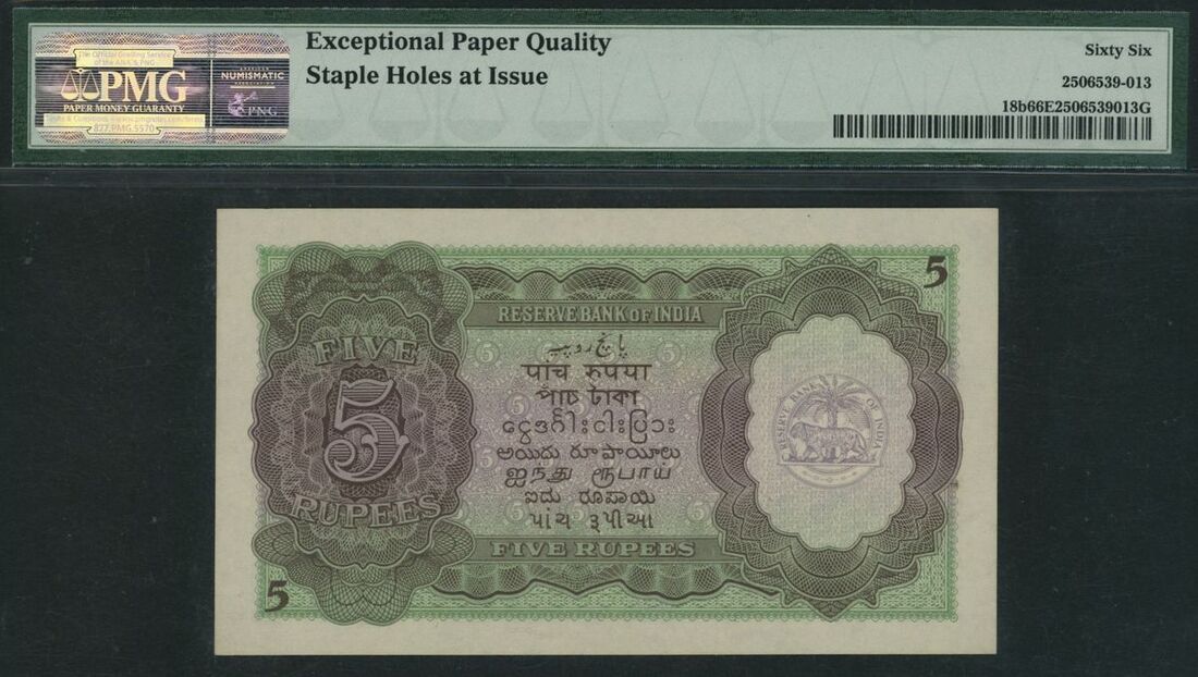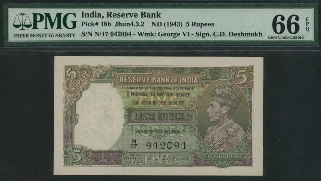 Reserve Bank, India, 5 Rupees, ND (1943), serial number N/17 942094, (Pick 18b, Jhun 4.3.2, BNB 202), in PMG holder 66 EPQ Gem Uncirculated, staple holes at issue